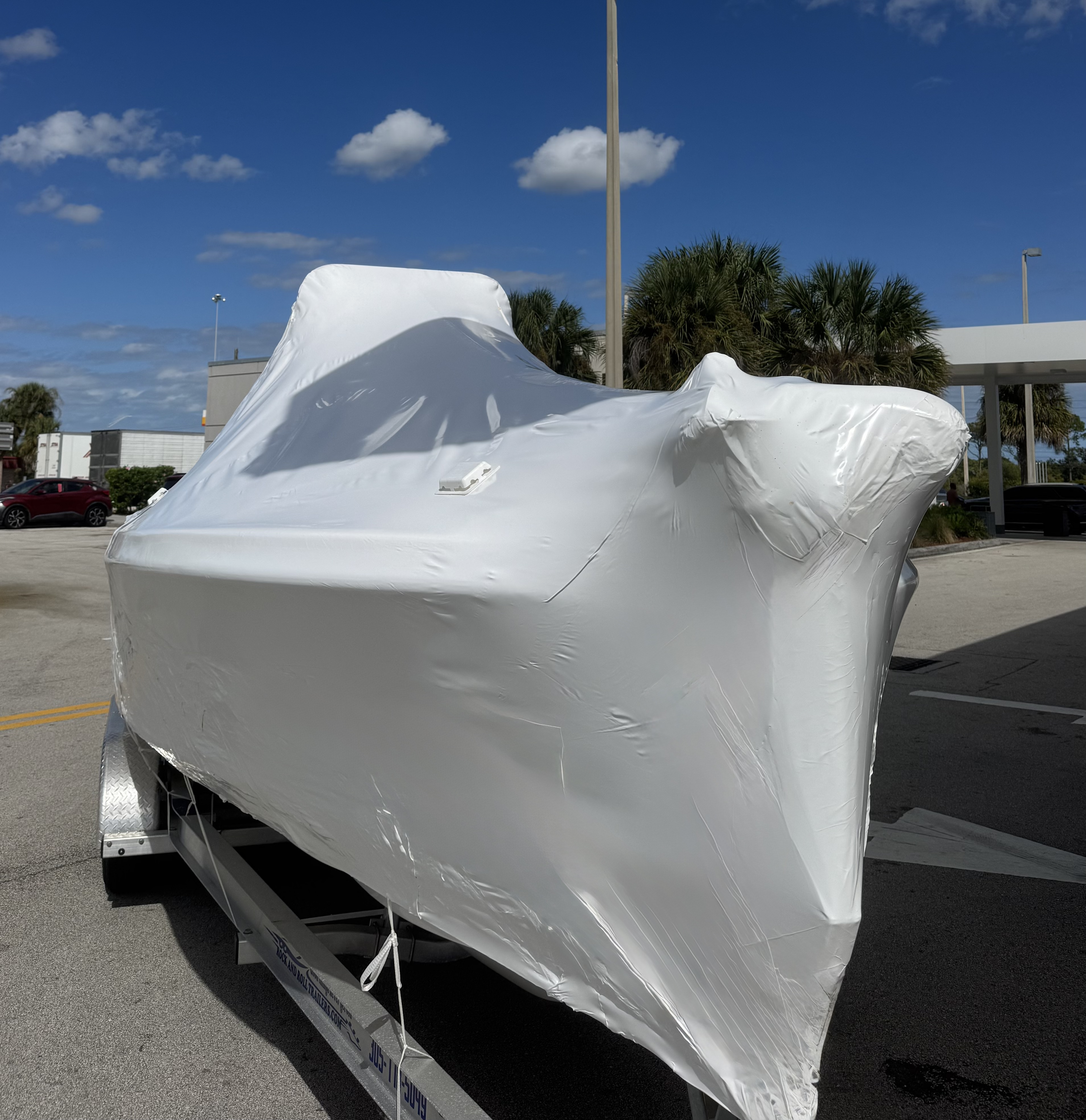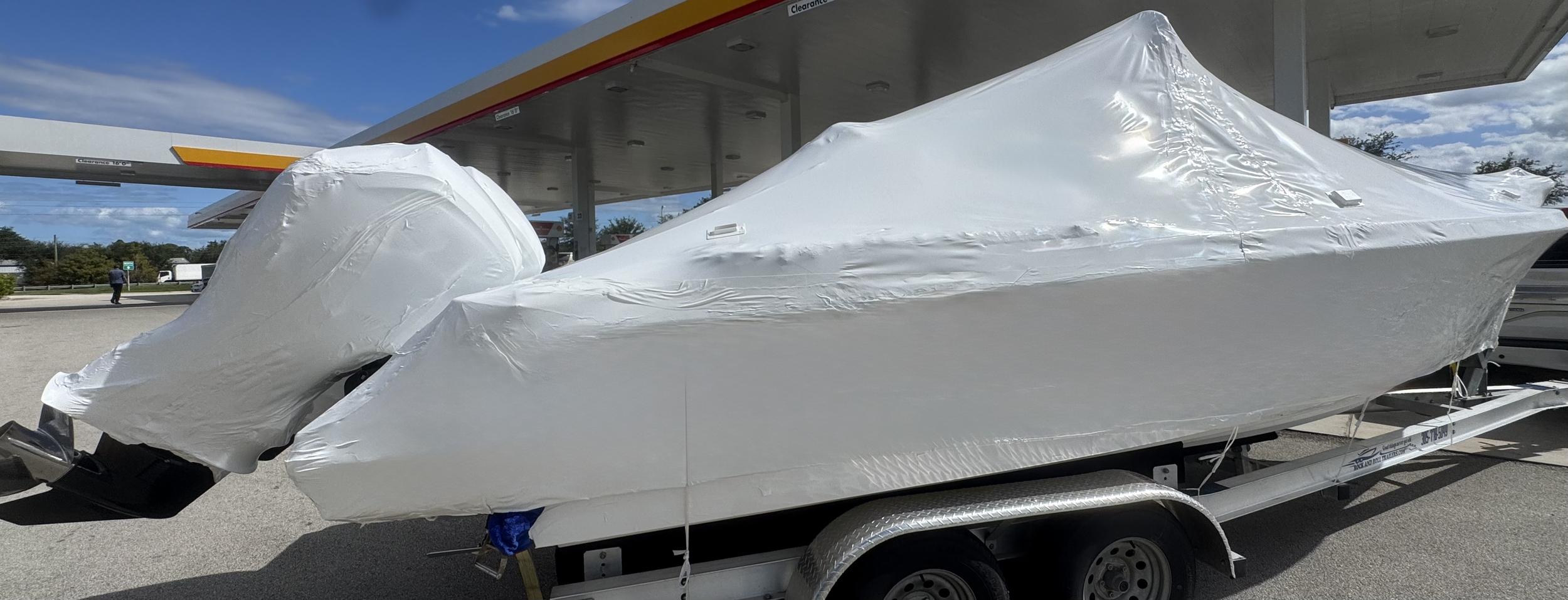 Shrink wrap can be used in a wide range of applications. Primary uses include winterizing boats, transporting boats, pallet wrapping, storing exterior boats, wrapping jet skis, exterior/patio furniture, equipment, cars, commercial equipment, engines, and aircraft. It can also be used for sectioning large vessels, wrapping RVs/travel trailers, golf carts, four-wheelers, motorcycles, and side-by-sides (SxS). The possibilities are virtually endless, and we are happy to wrap anything you need.
